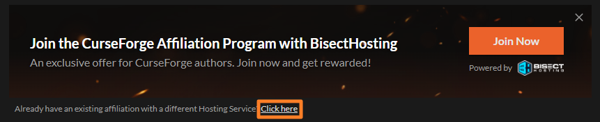 Nay, If you are already a Bisect Hosting partner, use the 3rd party custom affiliation to keep the same terms you currently have with Bisect. This also means you won't be getting your reward points through the CurseForge reward program.