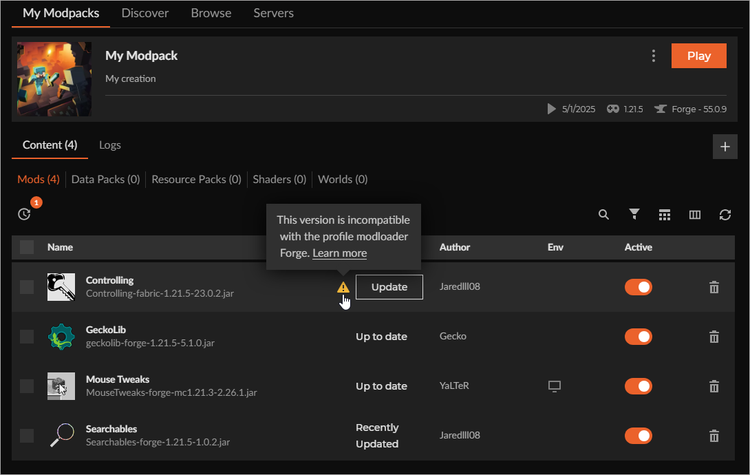 When browsing or editing modpacks in CurseForge, you’ll see different modloaders available: Forge, Fabric, NeoForge, and Quilt.