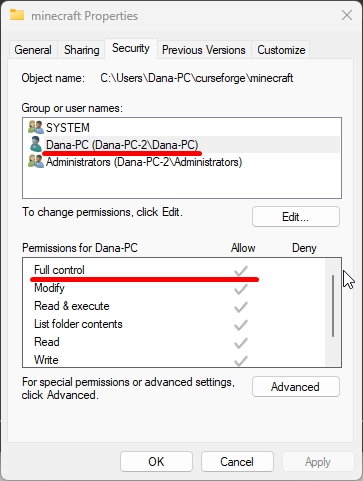 - Make sure that your Windows user has full control over the modding folder. For example: