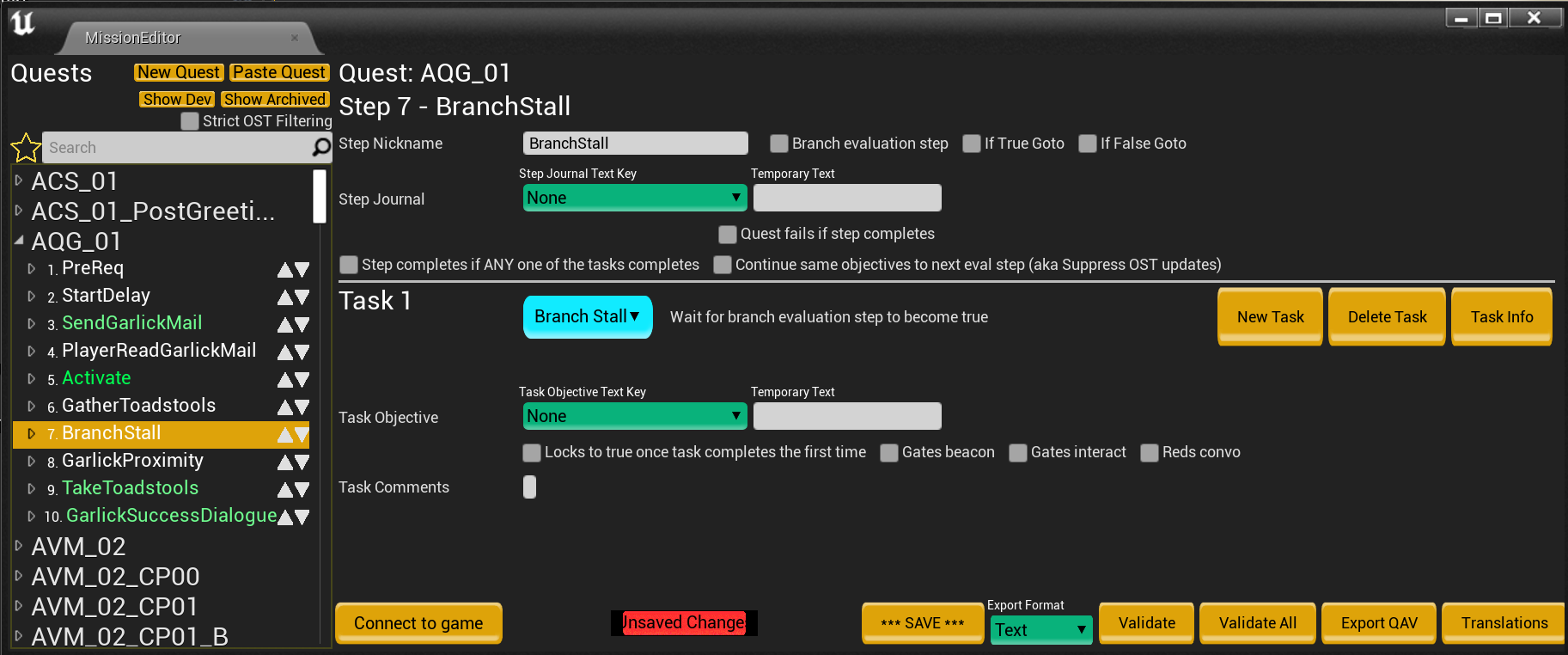 NOTE: Even though the Quest Editor will warn you about unsaved changes, it is recommended to save each time you make a change. - Use the first step of the quest to define prerequisites before the quest is made available to the player.