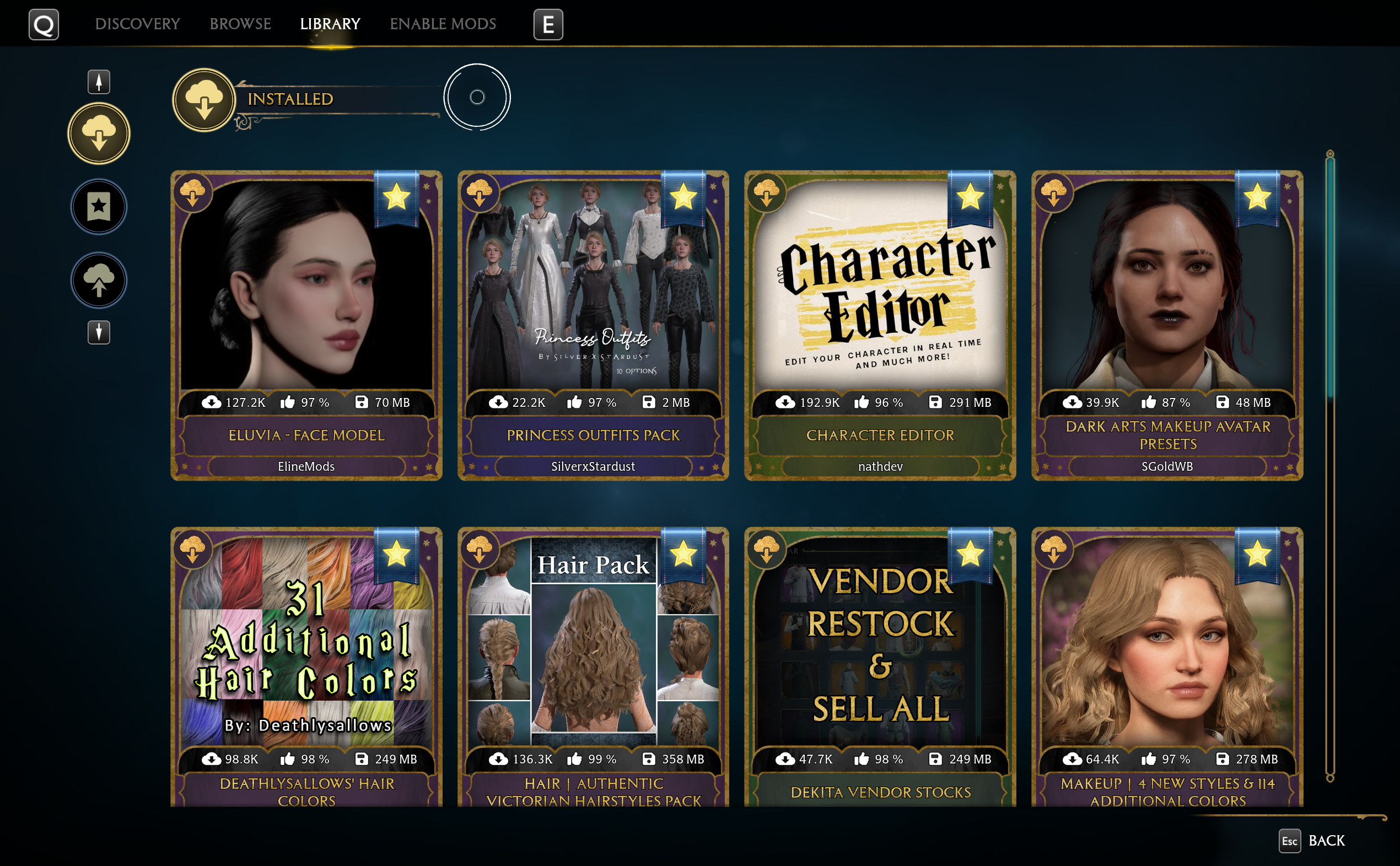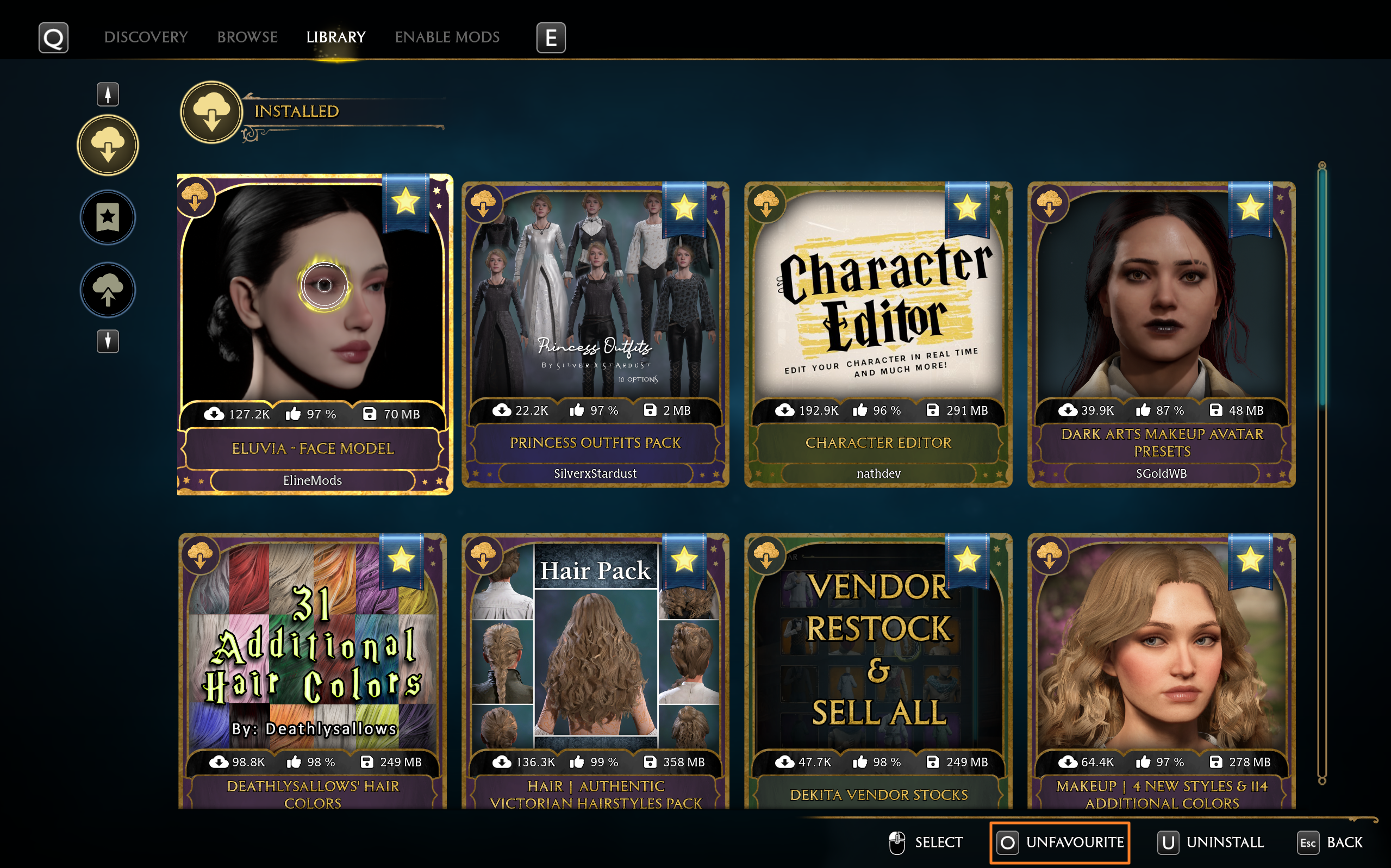 - Library- View all of your installed mods, Starred mods and uploaded mods: